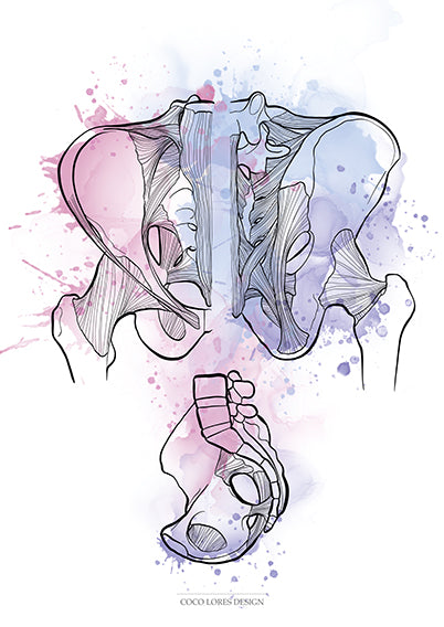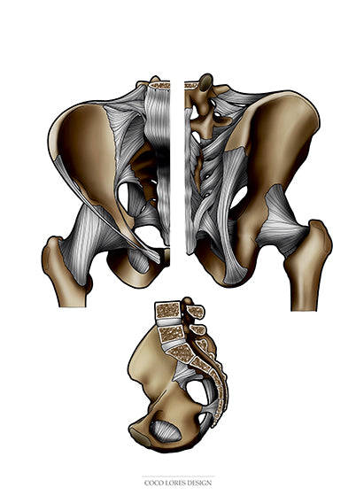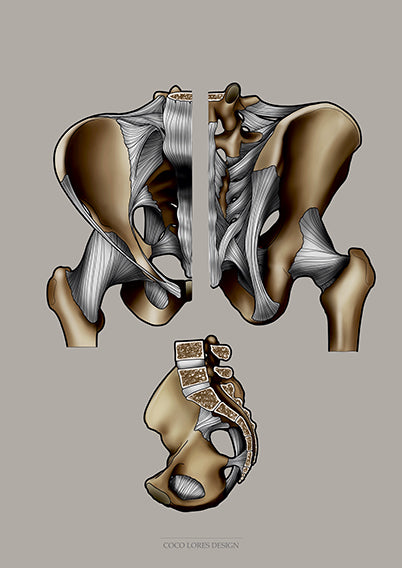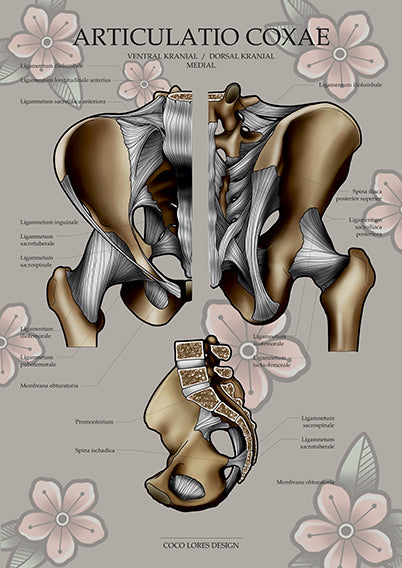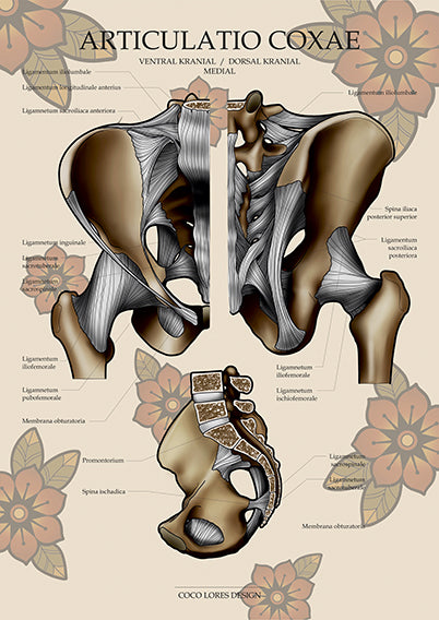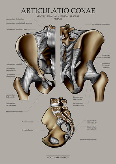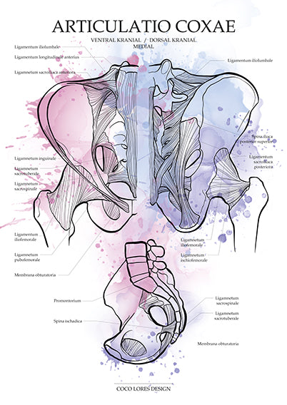 Diese Ansicht zeigt das Becken - Skelett (Articulatio coxae) in kranialer und medialer Ansicht.
